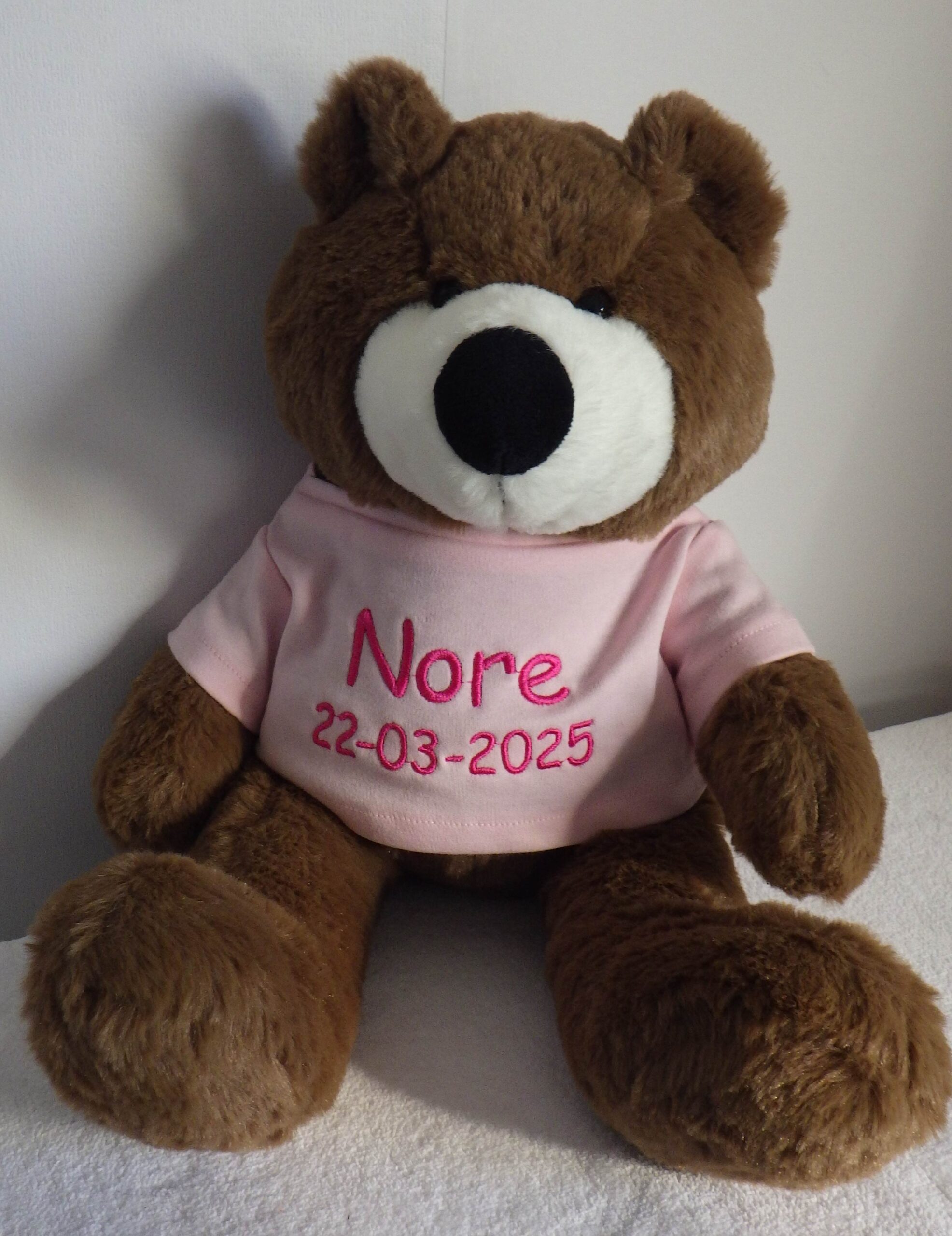 Het shirtje wordt geborduurd met naam en geboorte datum .